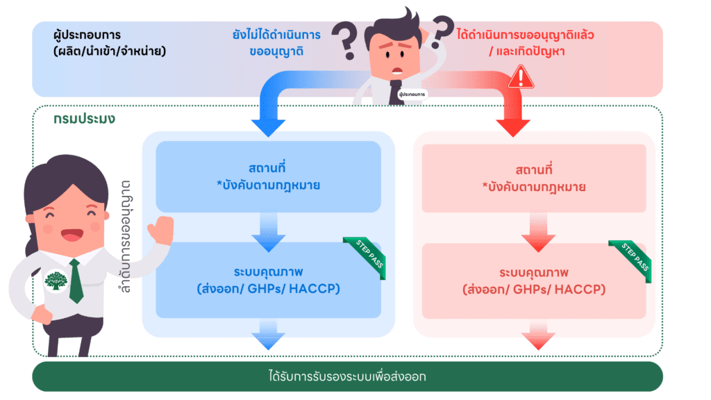 STEP PASS ตัวแทนขึ้นทะเบียนและขออนุญาตกับ กรมประมง สำนักงานคณะกรรมการอาหารและยา กรมประมง กรมปศุสัตว์ กรมสนับสนุนบริการสุขภาพ STEP PASS ตัวแทนขึ้นทะเบียนและขออนุญาตกับ กรมประมง สำนักงานคณะกรรมการอาหารและยา กรมประมง กรมปศุสัตว์ กรมสนับสนุนบริการสุขภาพ บริการเกี่ยวกับกรมประมง การขออนุญาตเพื่อการส่งออกสัตว์น้ำ ทำระบบกองตรวจสอบคุณภาพสินค้าประมงการตรวจรับรองหลักเกณฑ์และข้อกำหนดการตรวจรับรองโรงงานข้อกำหนด GMP และ HACCP ขอ Healthcerระเบียบ หลักเกณฑ์การส่งออกเงื่อนไขการออกใบรับรองสุขอนามัยตามประเทศที่มีข้อกำหนด 14-2-61 นำเข้าส่งออกสินค้าประเทศต่างๆ ตามประเทศนั้นๆระเบียบ หลักเกณฑ์การส่งออกหลักเกณฑ์การนำเข้าส่งออกสินค้าประเทศต่างๆ STEP PASS กับบทบาทในกระบวนการขออนุญาต ขั้นตอนการขอใบอนุญาต 1 การให้คำปรึกษาเบื้องต้น พูดคุยและให้คำปรึกษาเกี่ยวกับผลิตภัณฑ์ที่ต้องการขออนุญาตระบบคุณภาพ (GMP/ HACCP) 2 การเตรียมเอกสาร ช่วยจัดเตรียมเอกสารและข้อมูลที่จำเป็น 3 การยื่นคำขอ ยื่นขออนุญาตระบบคุณภาพ (GMP/ HACCP) 4 การติดตามสถานะ ติดตามสถานะการขออนุญาต/จดแจ้งและแจ้งให้ลูกค้าทราบ 5 ใบอนุญาต ได้รับใบอนุญาตตามที่ลูกค้าได้ยื่นคำขอ ทำไมต้องเลือก STEP PASS เชี่ยวชาญและมีประสบการณ์ ทีมงานของเรามีความเชี่ยวชาญและประสบการณ์ยาวนานในการให้บริการด้านการจดทะเบียน และรู้จักกระบวนการทุกขั้นตอนอย่างละเอียด บริการครบวงจร เราให้บริการแบบครบวงจร ตั้งแต่การให้คำปรึกษา การเตรียมเอกสาร จนถึงการจดทะเบียนสำเร็จ เพื่อให้คุณไม่ต้องกังวลเรื่องการดำเนินการต่างๆ ประหยัดเวลาและลดความยุ่งยาก ด้วยการใช้บริการของเรา คุณจะประหยัดเวลาและลดความยุ่งยากในกระบวนการจดทะเบียน ทำให้คุณสามารถมุ่งมั่นทำธุรกิจได้อย่างเต็มที่ การสนับสนุนที่ดีเยี่ยม เราให้คำปรึกษาและคำแนะนำในทุกขั้นตอนหลังได้รับอนุญาต พร้อมแก้ไขปัญหาอย่างทันท่วงที เพื่อให้คุณได้รับประสบการณ์ที่ดีที่สุด